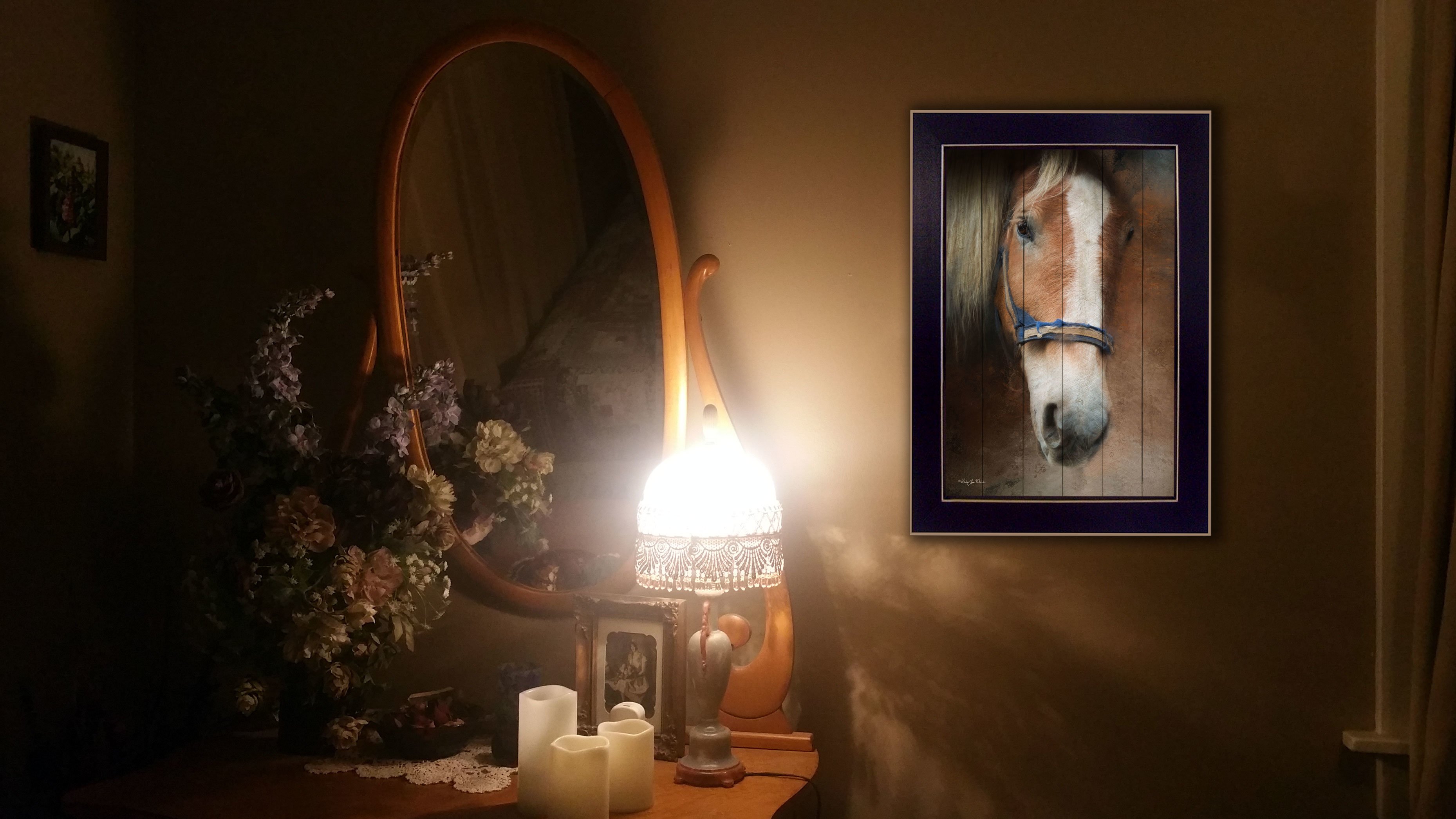 Blaze-14x20 horse framed print in a decorative black frame by artisan Robin Lee Vieira•Women Owned (WBE)•Textured Artwork with a 'rolled on' acid free acrylic coating to create a canvas painting effect. No glass is necessary.•UV protectant coating protects artwork from fading.•Arrives Ready to Hang