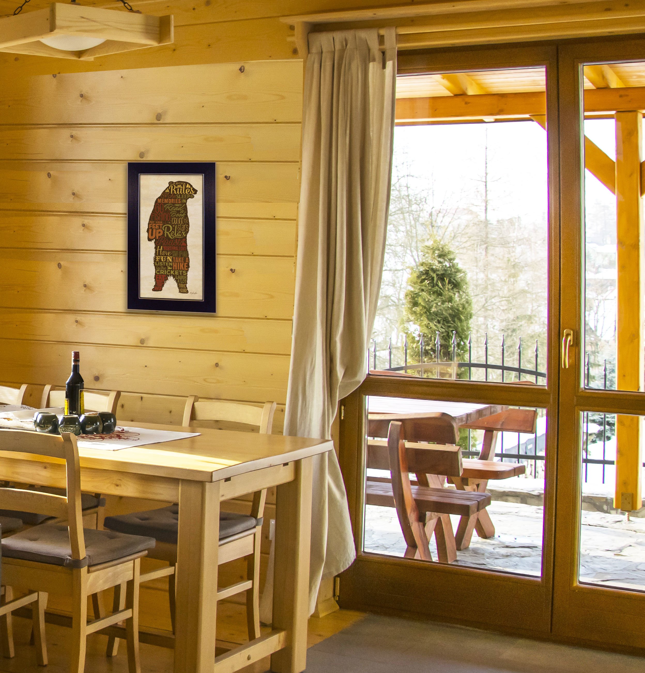 RAD1088-712, "Cabin Rules" is a 11"x20" framed art print by Lauren Rader. This decorative black framed print is uniquely written on the background of a bear. The print has a protective, archival finish (glass is not needed) and arrives ready to hang. Made in the USA with pride by skilled American workers.•Women Owned (WBE)•Textured Artwork with a 'rolled on' acid free acrylic coating to create a canvas painting effect. No glass is necessary.•UV protectant coating protects artwork from fading.•Arrives Ready to Hang