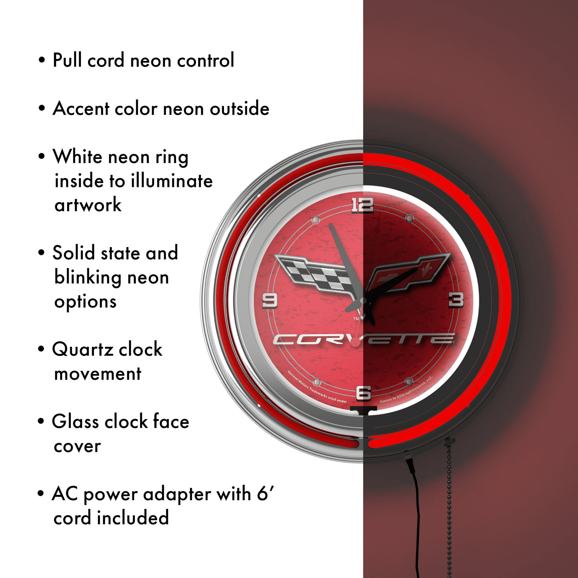 Officially licensed clock - this wall clock is equipped with one accent colored neon ring on the exterior of the clock and a brilliant white neon ring on the interior to light up the officially licensed logo.