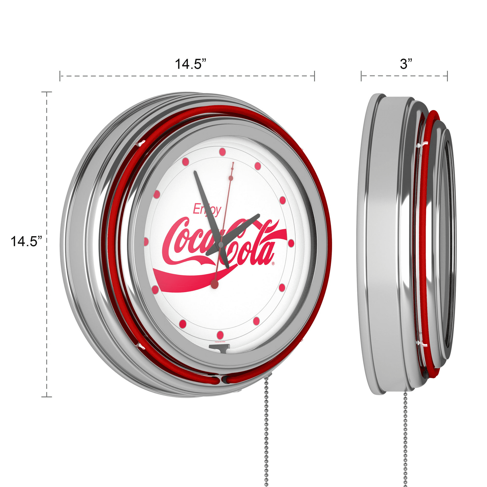 This officially licensed neon wall clock is the perfect addition to any game room, garage or man cave. This impressive clock has two neon rings; one is an accent colored neon ring on the exterior and the other is a brilliant white neon ring on the interior of the clock to light up your favorite logo. Other highlights include chrome finished resin housing and a high-grade glass clock face cover. The battery-operated quartz clock mechanism will keep it ticking for a long time, while the neon runs off the included ac adapter. The neon is controlled by the pull chain and the back of the clock includes a wall hanging mount and has two modes ? Solid state and blinking. The 3? Depth of this clock combined with the radiant shimmer of the neon reflecting off the chrome housing is sure to make this clock pop on any wall!