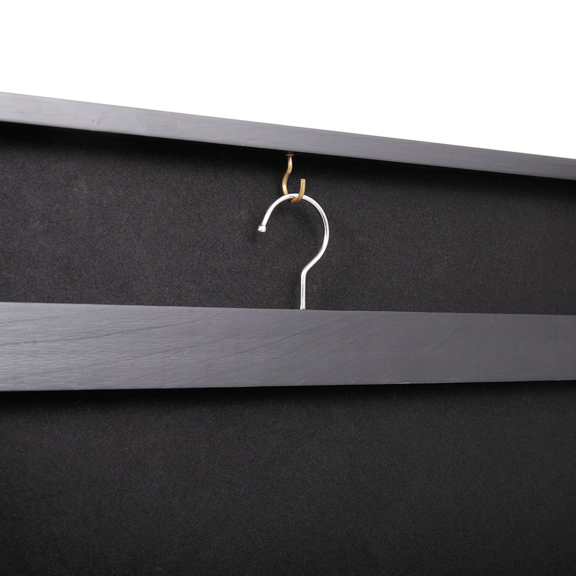 Specifications:Color: BlackMaterial: PineProduct Dimension: 23.23"L x 1.61"W x 31.3"HInner Dimension: 22.24"L x 0.98"W x 30.32"HHanger Length: 19.69"PS Board Thickness: 0.08"Net Weight: 5.18 lb