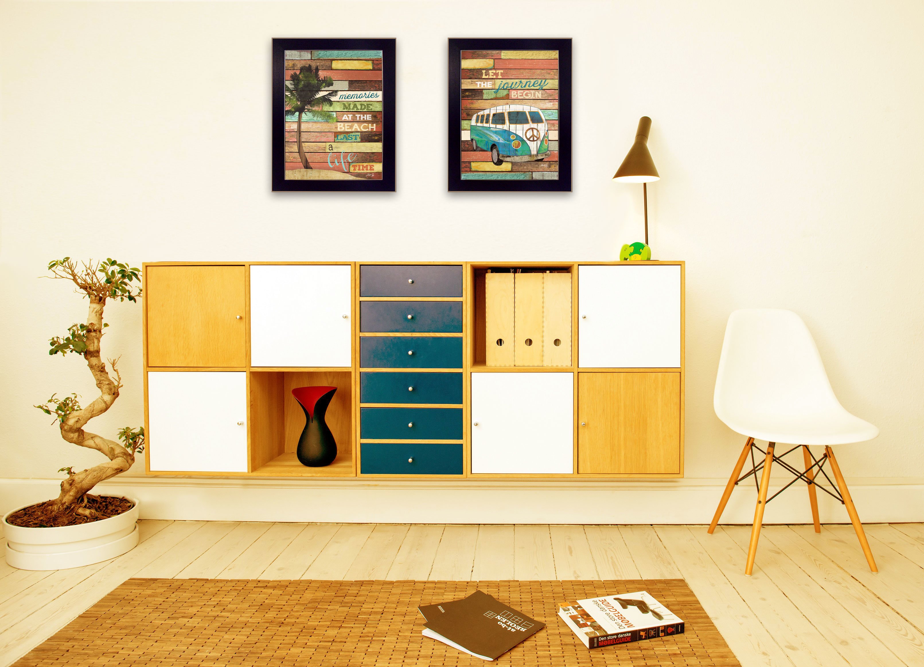 Journey is 2-14"x 18" framed prints by artist Marla Rae. This artwork features a wood plank look with a van and the words let the journey begin and a palm tree that reads memories made at the beach last a lifetime. These prints are textured and ready to hang.•Women Owned (WBE)•Textured Artwork with a 'rolled on' acid free acrylic coating to create a canvas painting effect. No glass is necessary.•UV protectant coating protects artwork from fading.•MDF moulding adds natural beauty to the framed art. Frame is keyholed for ease of hanging.