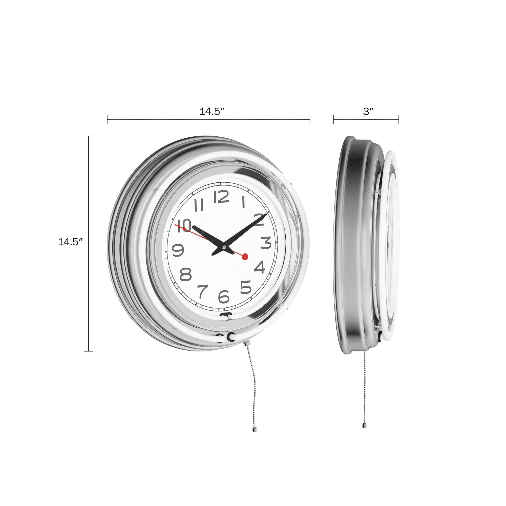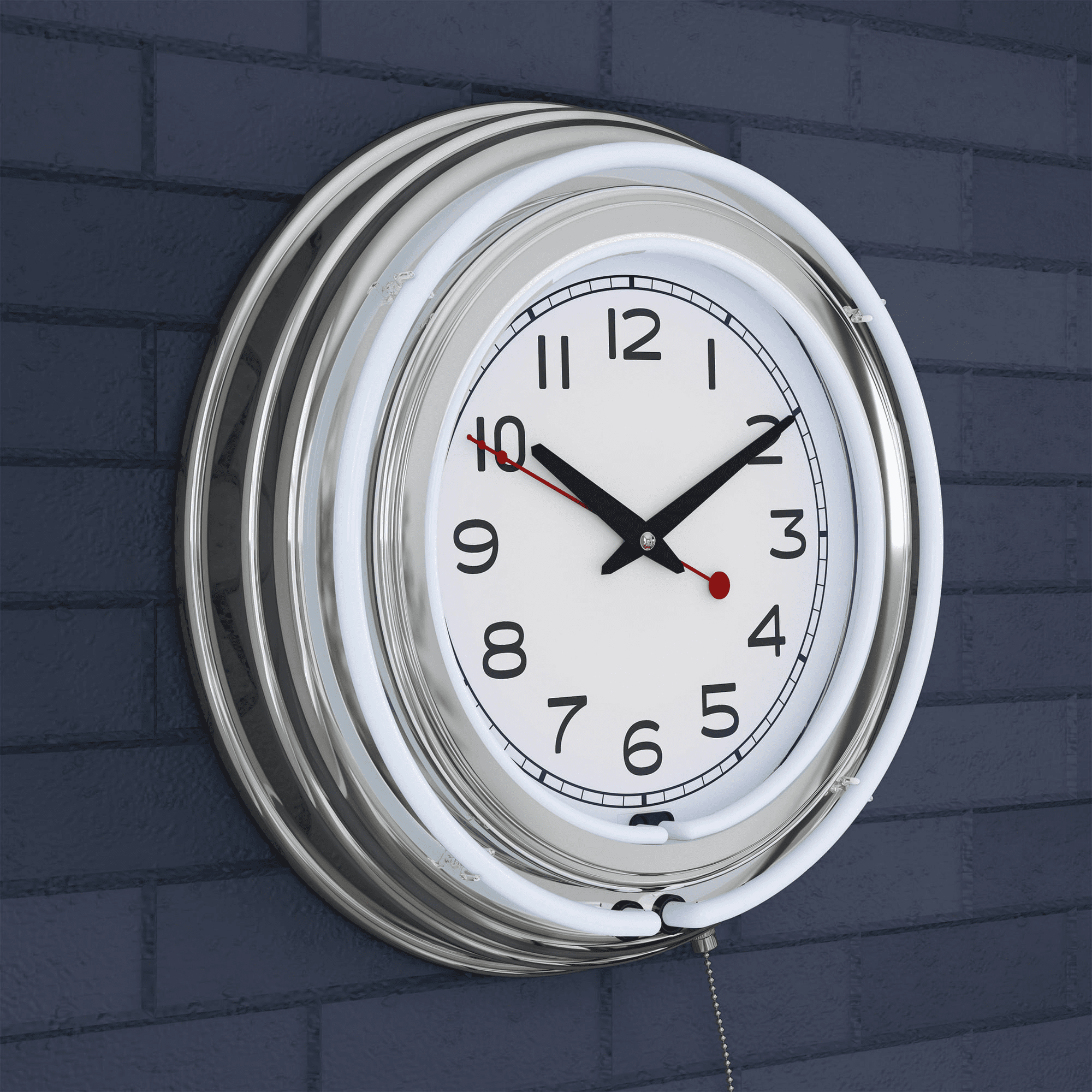 You and your friends can kick it old school with the stylish neon wall clock by lavish home! This light up clock features double neon rings, an interior band that illuminates the clock face and an exterior neon ring that glows in a crisp white accent color. This retro looking clock features a quartz crystal timekeeping mechanism that operates on 2aa batteries (not included), a 110v ac adapter to power the double neon rings and a wall hanging mount for easy installation. With a quality chrome finished resin housing and a high-grade glass clock face cover, this sleek clock makes it an excellent addition to any classic car garage, workshop, or mancave. The neon has two display modes - solid state and blinking and is controlled by a pull chain located at the bottom of the clock. The 3" depth of this clock combined with the radiant shimmer of the neon reflecting off the chrome housing is sure to make this clock pop on any wall! Great for use in game rooms, bars, or kitchens with retro vintage decor, you can also show off this chic clock outdoors to jazz up a 3 seasons room, covered patio, or deck space!