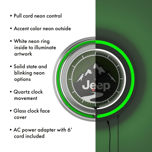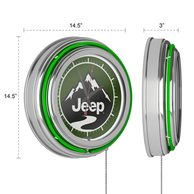 Home > Neon Wall Clock-Jeep Green Mountain Double Rung Analog Clock with Pull Chain-Pub, Garage, or Man Cave Accessories (Green)