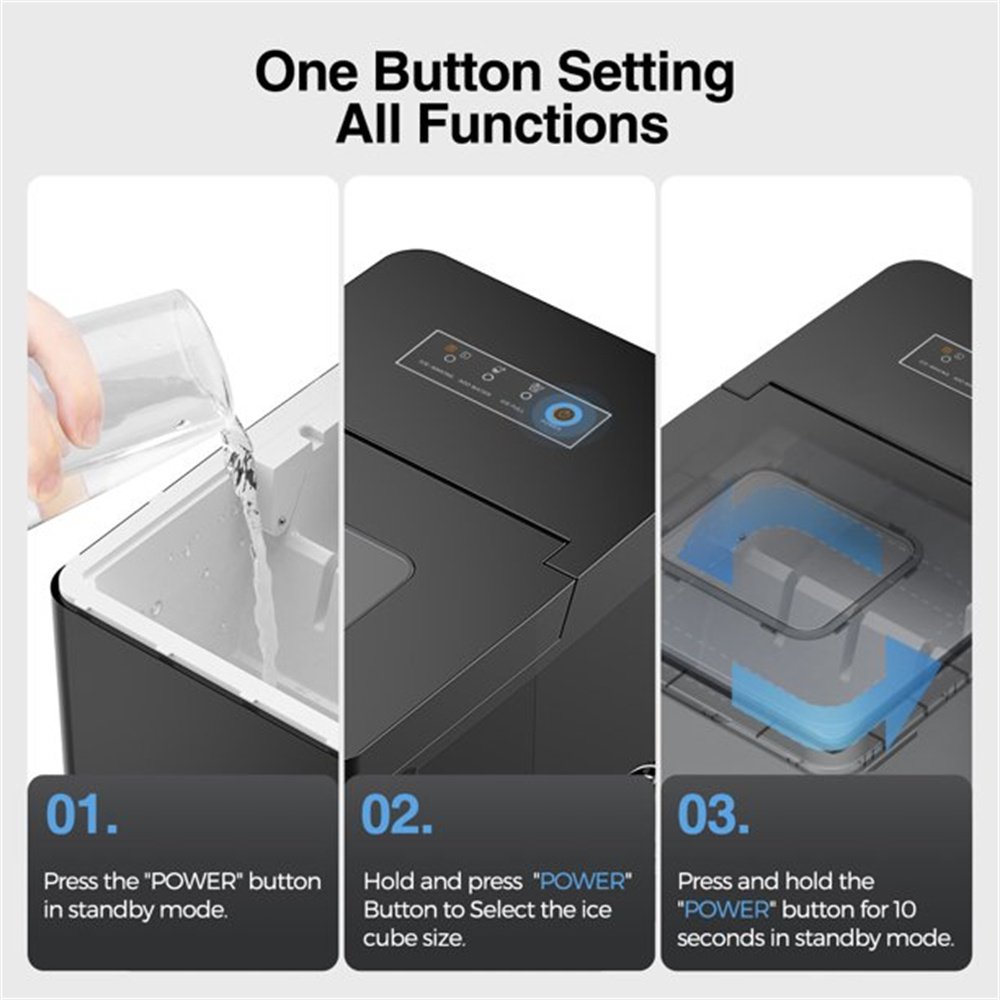 4.The transparent lid allows you to monitor the ice capacity. Our sensor automatically detects when ice is full and stop producing to prevent overflowing. One Button Switch Ice Size- Our control panel is very easy to operate. Fill the ice maker with water, press the on button, select the size of the ice cubes and that's it. When the water is insufficient or the ice basket is full, the indicator light will turn on.