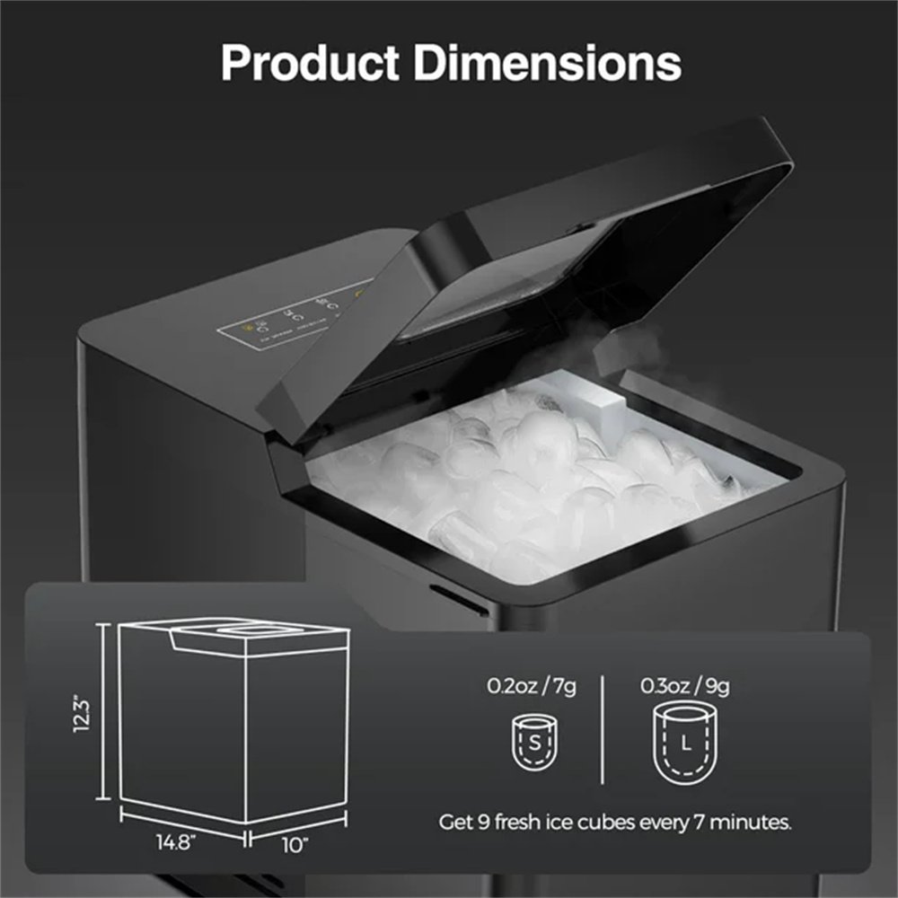 Fast Ice Making: The ice maker only takes 7 minutes to make 9 bullet-shaped ice cubes. Fill 1.8L of water into the water tank; max ice capacity can be 33 pounds in 24 hours. Two Sizes of Ice Cubes You can make two different sizes of ice cubes. Small ice cubes can chill seafood and beer keeping it fresh and cold. Large ice cubes are more suitable for beverages to achieve a rapid cooling effect. Quiet and User Friendly: When making ice cubes; the noise is lower than 40dB; similar to a working refrigerator. The transparent lid allows you to monitor the ice capacity. Our sensor automatically detects when ice is full and stop producing to prevent overflowing. One Button Switch Ice Size- Our control panel is very easy to operate. Fill the ice maker with water; press the on button; select the size of the ice cubes and that's it. When the water is insufficient or the ice basket is full; the indicator light will turn on. & Self-Cleaning: Our ice maker is light and efficient; with a size of 9.9x14x812.3 inches. Press the on/off button for 5 seconds to start the self-cleaning process. You can also open the entire lid to clean the refrigeration room. Ice making capacity: 15kg/24h(21 Temperature/10.