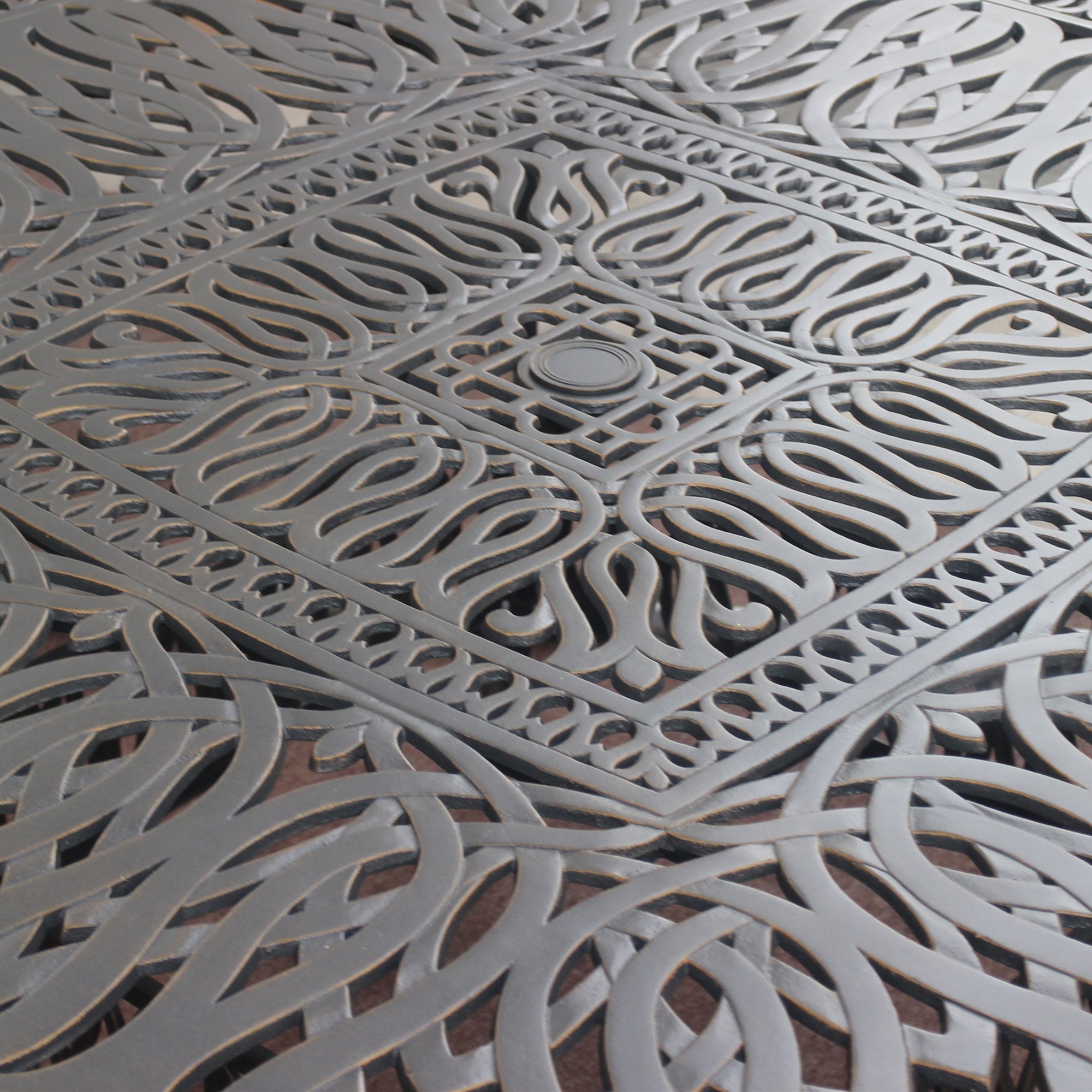 Inspired by the elegant sensibilities of French Quarter architecture; this cast aluminum 64" Square Dining Table Table flawlessly combines expert craftmanship and intricate details. The Geneva Collection showcases a beautiful Tulip pattern which symbolizes perfect love that will last forever; A feeling that will be shared with this collection for years to come. High quality sling or tailored cushions complete the look to create a perfectly sweet silhouette. Geneva offers a generous range of seating and dining pieces that provide countless options equally suitable for outdoor spaces; large and small. Make a practical and stylish addition to your dining space.Frame color looks amazing.Ideal for dining room; patio; porch; poolside; or garden.Table sits six.Cast Aluminum Construction stays 100 percent Rust Free! Durable and quality made for years of use.